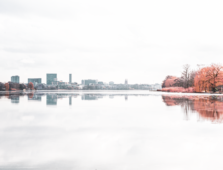 This motif shows a panoramic view of the Alster Lake in Hamburg, Germany. The photo was taken on a bright, sunny day. I use special post production techniques to desaturate the colours and additionally I change the hue of certain colours.